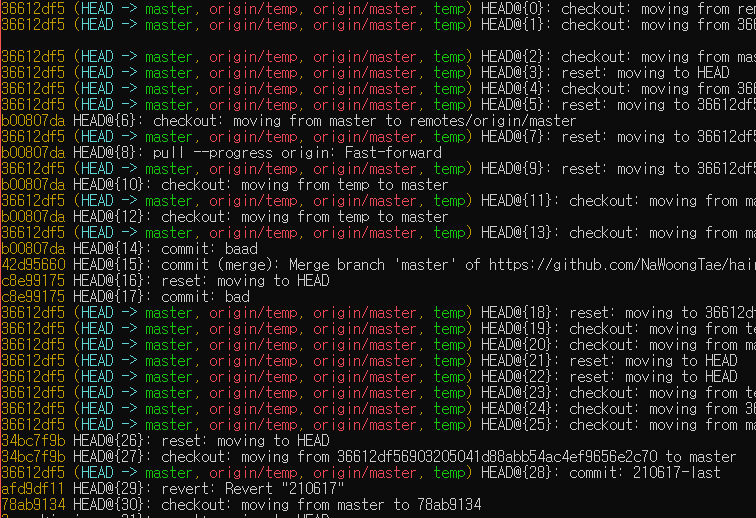 - commit, checkout, merge등 사용했던 모든 log가 출력된다고 한다.